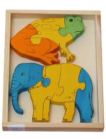 Nombre: RANA-ELEFANTE Edad: 2 años+ Núm. piezas/contenido: conjunto de 2 puzzles de 3 y 5 piezas Medidas: 23 x 17,5 x 2,8 cm. | |