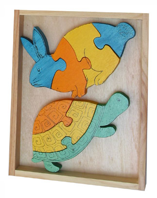 | Nombre: CONEJO-TORTUGA Edad: 2 años+ Núm. piezas/contenido: conjunto de 2 puzzles de 4 y 3 piezas Medidas: 23 x 17,5 x 2,8 cm. | |