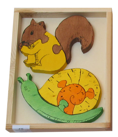 | Nombre: ARDILLA-CARACOL Edad: 2 años+ Núm. piezas/contenido: conjunto de 2 puzzles de 3 y 4 piezas Medidas: 23 x 17,5 x 2,8 cm. | |