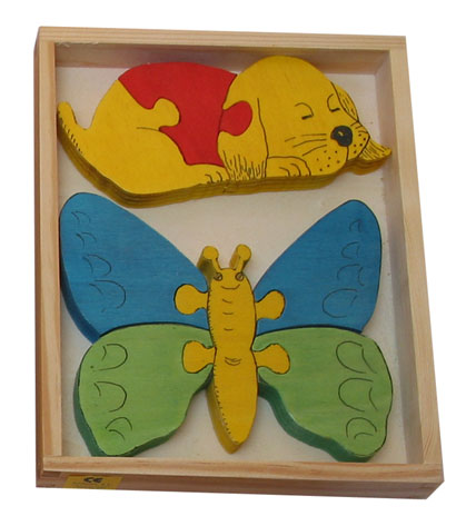 | Nombre: PERRO-MARIPOSA Edad: 2 años+ Núm. piezas/contenido: conjunto de 2 puzzles de 3 y 5 piezas Medidas: 23 x 17,5 x 2,8 cm. | |